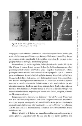 desplegando toda su fuerza y esplendor. Conmovido por la fuerza poética y su trasfondo humano, y mediante un perfecto equilibrio entre contenido y forma, su expresión gráfica va más allá de la metáfora evocadora del poeta, y su lenguaje pictórico se impregna de lirismo (Figura 5). Perteneciente a la ‘col·lecció galeria’, de la Galería Rosalía Sender, Els Ulls del Mar (Figura 6) consta de seis poemas de Ramón Guillem, impresos en offset por la imprenta Comunicación Gráfica y seis serigrafías de Guinovart., estampados por el taller Seriarte con una tirada de 100 ejemplares y 5 P.A. El texto de presentación es de Romà de la Calle y el diseño es de Manuel Granell y María Casanova. Este Libro-Arte es una obra de formato íntimo y delicadísimo lirismo. Aquí los azules predominantes marcan sus creaciones marítimas dejando entrever la estrecha relación de Guinovart con el Mar Mediterráneo. Un Mediterráneo presente desde su más tierna infancia lleno de alegorías, mitos, e historias de la humanidad. Un mar donde ‘el creador ha de ser náufrago, para enfrentarse a la obra sin prejuicios y de una manera aislada, marginal, a la deriva (Mercadé, 2008: 120). Las primeras obras García Lorca-Guinovart y Salvat-Papasseit–Guinovart, van más allá del concepto Libros Ilustrados aunque ciertamente hacen referencia, en mayor o menor grado, al contenido del texto al que acompañan y se encuentran en algún punto intermedio entre los Livres d’Artiste y los Libros de Artista. Las ediciones de madurez se enmarcan, a nuestro entender, dentro del Libro-Arte. El Livre d’Artiste o de Peintre es una colaboración entre editor, escritor y artista plástico. La participación de cada uno de ellos dentro del libro está