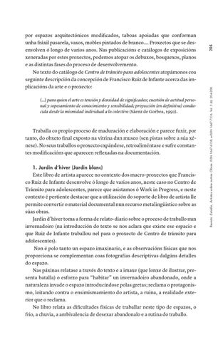 por espazos arquitectónicos modificados, taboas apoiadas que conforman unha fráxil pasarela, vasos, mobles pintados de branco…. Proxectos que se desenvolven ó longo de varios anos. Nas publicacións e catálogos de exposicións xeneradas por estes proxectos, podemos atopar os debuxos, bosquexos, planos e as distintas fases do proceso de desenvolvemento. No texto do catálogo de Centro de tránsito para adolescentes atopámonos coa seguinte descripción da concepción de Francisco Ruiz de Infante acerca das implicacións da arte e o proxecto: