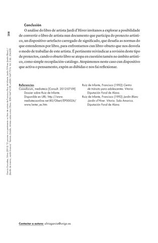 García González, Silvia (2012) “O proceso e o pentimento no libro de artista de Francisco Ruiz de Infante: Jardin D’Hiver (Jardin Blanc) / (Xardín de inverno, xardín branco).” Revista :Estúdio, Artistas sobre outras Obras. ISSN 1647-6158, e-ISSN 1647-7316. Vol. 3 (6): 204-208.