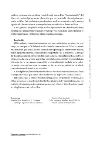 El libro objeto es considerado como una nueva disciplina artística, sin embargo, no siempre es fácil clasificar el trabajo de ciertos artistas. Tal es el caso de Ana Sánchez, que utiliza el libro como materia prima para obras que se ubican, por su apariencia formal, en el ámbito de la pintura o de la escultura. El arraigo de disciplinas claramente definidas en el campo de las artes plásticas subyace en las obras de esta artista, que utiliza con inteligencia, ironía y originalidad, un objeto de fuerte carga conceptual, el libro, como elemento modular en la elaboración de composiciones que conservan un fuerte carácter pictórico o escultórico en el más tradicional de los sentidos. A nivel plástico, las metáforas visuales de Ana Sánchez contienen una fuerte carga emocional que añade valor a una obra de impecable factura técnica. El hecho de que la obra de Ana Sánchez aparente ser pintura o escultura, nos obliga a plantear la cuestión de la interdisciplinariedad y permeabilidad de los múltiples lenguajes plásticos contemporáneos y cómo el libro de artista puede ser el aglutinante de todos ellos.