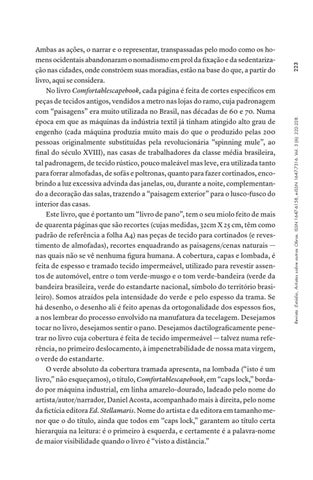 Ambas as ações, o narrar e o representar, transpassadas pelo modo como os homens ocidentais abandonaram o nomadismo em prol da fixação e da sedentarização nas cidades, onde constróem suas moradias, estão na base do que, a partir do livro, aqui se considera. No livro Comfortablescapebook, cada página é feita de cortes específicos em peças de tecidos antigos, vendidos a metro nas lojas do ramo, cuja padronagem com “paisagens” era muito utilizada no Brasil, nas décadas de 60 e 70. Numa época em que as máquinas da indústria textil já tinham atingido alto grau de engenho (cada máquina produzia muito mais do que o produzido pelas 200 pessoas originalmente substituídas pela revolucionária “spinning mule”, ao final do século XVIII), nas casas de trabalhadores da classe média brasileira, tal padronagem, de tecido rústico, pouco maleável mas leve, era utilizada tanto para forrar almofadas, de sofás e poltronas, quanto para fazer cortinados, encobrindo a luz excessiva advinda das janelas, ou, durante a noite, complementando a decoração das salas, trazendo a “paisagem exterior” para o lusco-fusco do interior das casas. Este livro, que é portanto um “livro de pano”, tem o seu miolo feito de mais de quarenta páginas que são recortes (cujas medidas, 32cm X 25 cm, têm como padrão de referência a folha A4) nas peças de tecido para cortinados (e revestimento de almofadas), recortes enquadrando as paisagens/cenas naturais — nas quais não se vê nenhuma figura humana. A cobertura, capas e lombada, é feita de espesso e tramado tecido impermeável, utilizado para revestir assentos de automóvel, entre o tom verde-musgo e o tom verde-bandeira (verde da bandeira brasileira, verde do estandarte nacional, símbolo do território brasileiro). Somos atraídos pela intensidade do verde e pelo espesso da trama. Se há desenho, o desenho ali é feito apenas da ortogonalidade dos espessos fios, a nos lembrar do processo envolvido na manufatura da tecelagem. Desejamos tocar no livro, desejamos sentir o pano. Desejamos dactilograficamente penetrar no livro cuja cobertura é feita de tecido impermeável — talvez numa referência, no primeiro deslocamento, à impenetrabilidade de nossa mata virgem, o verde do estandarte. O verde absoluto da cobertura tramada apresenta, na lombada (“isto é um livro,” não esqueçamos), o título, Comfortablescapebook, em “caps lock,” bordado por máquina industrial, em linha amarelo-dourado, ladeado pelo nome do artista/autor/narrador, Daniel Acosta, acompanhado mais à direita, pelo nome da fictícia editora Ed. Stellamaris. Nome do artista e da editora em tamanho menor que o do título, ainda que todos em “caps lock,” garantem ao título certa hierarquia na leitura: é o primeiro à esquerda, e certamente é a palavra-nome de maior visibilidade quando o livro é “visto a distância.”