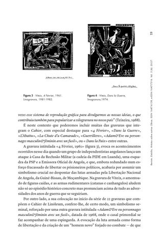 vezes esse sistema de reprodução gráfica para divulgarmos as nossas ideias, o que contribuiu também para popularizar a xilogravura no nosso país” (Teixeira, 1988). É neste contexto que poderemos incluir muitas das gravuras que integram o Cahier, com especial destaque para «4 Février», «Dans la Guerre», «L’Abattu», «La Chute d’u Camarade», «Guerrillero», «Adam&Eve ou personnages masculin&féminin avec un fusil», ou « Dans la Paix» entre outras. A gravura intitulada «4 Février, 1961» (figura 3), evoca os acontecimentos ocorridos nesse dia quando um grupo de independentistas angolanos lança um ataque à Casa da Reclusão Militar (a cadeia da PIDE em Luanda), uma esquadra da PSP e a Emissora Oficial de Angola, e que, embora redundado num esforço fracassado de libertar os prisioneiros políticos, acabaria por assumir um simbolismo crucial no despontar das lutas armadas pela Libertação Nacional de Angola, da Guiné-Bissau, de Moçambique. Na gravura de Viteix, o amontoado de figuras caídas, e as armas rudimentares (catanas e canhangulos) aludem não só ao episódio histórico concreto mas pronunciam acima de tudo as adversidades dos anos de guerra que se seguiriam. Por outro lado, a sua colocação no início da série de 22 gravuras que compõem o Cahier de Linóleum, confere-lhe, de certo modo, um simbolismo seminal, reforçado por uma outra gravura intitulada «Adam&Eve ou personnages masculin&féminin avec un fusil», datada de 1968, onde o casal primordial se faz acompanhar de uma espingarda. A evocação da luta armada como forma de libertação e da criação de um “homem novo” forjado no combate — de que