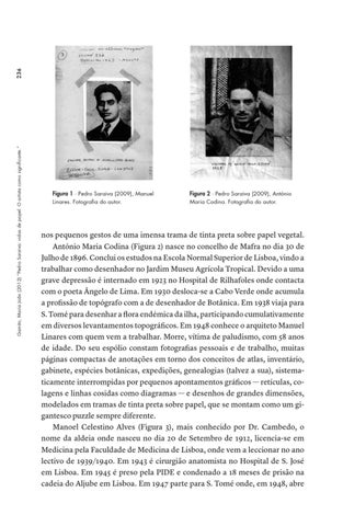 nos pequenos gestos de uma imensa trama de tinta preta sobre papel vegetal. António Maria Codina (Figura 2) nasce no concelho de Mafra no dia 30 de Julho de 1896. Conclui os estudos na Escola Normal Superior de Lisboa, vindo a trabalhar como desenhador no Jardim Museu Agrícola Tropical. Devido a uma grave depressão é internado em 1923 no Hospital de Rilhafoles onde contacta com o poeta Ângelo de Lima. Em 1930 desloca-se a Cabo Verde onde acumula a profissão de topógrafo com a de desenhador de Botânica. Em 1938 viaja para S. Tomé para desenhar a flora endémica da ilha, participando cumulativamente em diversos levantamentos topográficos. Em 1948 conhece o arquiteto Manuel Linares com quem vem a trabalhar. Morre, vítima de paludismo, com 58 anos de idade. Do seu espólio constam fotografias pessoais e de trabalho, muitas páginas compactas de anotações em torno dos conceitos de atlas, inventário, gabinete, espécies botânicas, expedições, genealogias (talvez a sua), sistematicamente interrompidas por pequenos apontamentos gráficos — retículas, colagens e linhas cosidas como diagramas — e desenhos de grandes dimensões, modelados em tramas de tinta preta sobre papel, que se montam como um gigantesco puzzle sempre diferente. Manoel Celestino Alves (Figura 3), mais conhecido por Dr. Cambedo, o nome da aldeia onde nasceu no dia 20 de Setembro de 1912, licencia-se em Medicina pela Faculdade de Medicina de Lisboa, onde vem a leccionar no ano lectivo de 1939/1940. Em 1943 é cirurgião anatomista no Hospital de S. José em Lisboa. Em 1945 é preso pela PIDE e condenado a 18 meses de prisão na cadeia do Aljube em Lisboa. Em 1947 parte para S. Tomé onde, em 1948, abre