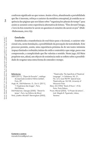 conferem significado ao que vemos. Assim o livro, abandonada a portabilidade que lhe é inerente, reforça o carácter da metáfora conceptual, já contida na sequência das páginas que nos falam sobre “organizações plurais do tempo” para assim se assumir como experiência alternativa de leitura. “Être devant l’image, c’est à la fois remettre le savoir en question et remettre du savoir en jeu” (Didi-Hubermam, 2011: 83). Conclusão