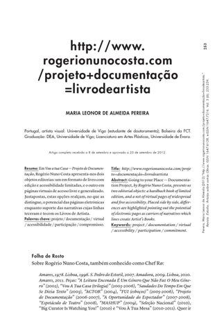253 Pereira, Maria Leonor de Almeida (2012) “http://www.rogerionunocosta.com/projeto+documentação=livrodeartista.” Revista :Estúdio, Artistas sobre outras Obras. ISSN 1647-6158, e-ISSN 1647-7316. Vol. 3 (6): 253-259.