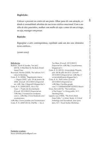 Tua Mesa. [Consult. 2012-08-01] Disponível em <URL:http://vouatuamesa. blogspot.pt/> Costa, R. N. (2012), Universidade/Yliopisto, pub. 06 de Julho de 2012. [Consult. 2012-08-01] Disponível em <URL:http:// universidadyliopisto.blogspot.be/> Costa, R. N., Perfil online. [Consult. 2012-08-01] Disponível em <URL:https://profiles.google. com/111364644343081425925/about> Groys, Boris (2010), “The Loneliness of the Project,” in Going public, N.Y.: Sternberg Press. Lippard, Lucy (1985), “The Artist’s Book Goes Public,” in Artists’ Books: A Critical Anthology and Sourcebook, Joan Lyons (ed.), N.Y.: Visual Studies Workshop.