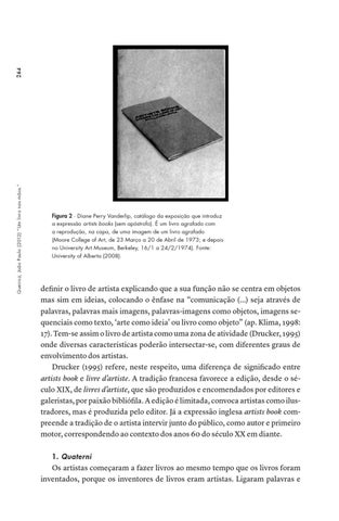 definir o livro de artista explicando que a sua função não se centra em objetos mas sim em ideias, colocando o ênfase na “comunicação (...) seja através de palavras, palavras mais imagens, palavras-imagens como objetos, imagens sequenciais como texto, ‘arte como ideia’ ou livro como objeto” (ap. Klima, 1998: 17). Tem-se assim o livro de artista como uma zona de atividade (Drucker, 1995) onde diversas características poderão intersectar-se, com diferentes graus de envolvimento dos artistas. Drucker (1995) refere, neste respeito, uma diferença de significado entre artists book e livre d’artiste. A tradição francesa favorece a edição, desde o século XIX, de livres d’artiste, que são produzidos e encomendados por editores e galeristas, por paixão bibliófila. A edição é limitada, convoca artistas como ilustradores, mas é produzida pelo editor. Já a expressão inglesa artists book compreende a tradição de o artista intervir junto do público, como autor e primeiro motor, correspondendo ao contexto dos anos 60 do século XX em diante. 1. Quaterni