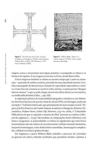 viagens, torna o missionário uma figura possível, e acompanha as ideias e os homens de espírito. E nas viagens escrevem-se livros, desde Marco Polo. O livro impresso também se afirma ao mesmo tempo que o autor se emancipa — passando de artífice a artista, investido de uma autoridade interior. O artista emancipado da Renascença é dotado de capacidade especulativa e criativa. Como Zuccari comenta no seu livro sobre artistas, o artista possui “disegno interno umano,” a que se pode chegar através do reflexo divino no seu interior, a scintilla della divinitá (L’idea…, cap. VII). A exploração plástica da materialidade tipográfica cristaliza-se nos labirintos dos livros barrocos de poesia visual do século XVII, em Portugal, sendo um exemplo o “Labirinto intrincado, que principiando do meio sempre se lerá” (Figura 3) de Frei Francisco da Cunha: Oraçam Académica e Panegyria, História e Enconiástica, Prefano-Sacra. Lisboa: Off. Alvarense, 1747 ou, ainda, o “Labyrintho Difficultoso em que se expende a matéria da Obra” presente no volume Collecçaõ dos applausos,… (1745). São insólitas as composições destes labirintos com letras e anagramas. A materialidade e a ênfase no significante que estes livros testemunham não são indício de inconformismo: tinham intenção laudatória, traçavam homenagem, eram dedicatórias extendidas, homenagens complicadas, exibição na retórica gráfica do tipo. Em Inglaterra o poeta William Blake trabalha o processo do estereótipo ou gravura em relevo, obtendo resultados que permitem simular a pintura a