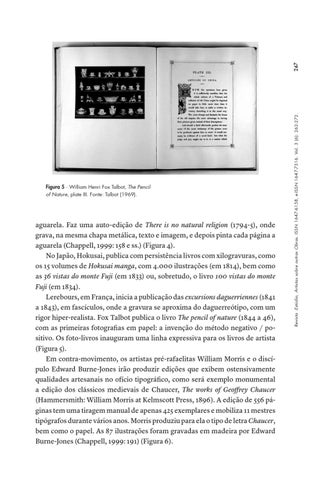 aguarela. Faz uma auto-edição de There is no natural religion (1794-5), onde grava, na mesma chapa metálica, texto e imagem, e depois pinta cada página a aguarela (Chappell, 1999: 158 e ss.) (Figura 4). No Japão, Hokusai, publica com persistência livros com xilogravuras, como os 15 volumes de Hokusai manga, com 4.000 ilustrações (em 1814), bem como as 36 vistas do monte Fuji (em 1833) ou, sobretudo, o livro 100 vistas do monte Fuji (em 1834). Lerebours, em França, inicia a publicação das excursions daguerriennes (1841 a 1843), em fascículos, onde a gravura se aproxima do daguerreótipo, com um rigor hiper-realista. Fox Talbot publica o livro The pencil of nature (1844 a 46), com as primeiras fotografias em papel: a invenção do método negativo / positivo. Os foto-livros inauguram uma linha expressiva para os livros de artista (Figura 5). Em contra-movimento, os artistas pré-rafaelitas William Morris e o discípulo Edward Burne-Jones irão produzir edições que exibem ostensivamente qualidades artesanais no ofício tipográfico, como será exemplo monumental a edição dos clássicos medievais de Chaucer, The works of Geoffrey Chaucer (Hammersmith: William Morris at Kelmscott Press, 1896). A edição de 556 páginas tem uma tiragem manual de apenas 425 exemplares e mobiliza 11 mestres tipógrafos durante vários anos. Morris produziu para ela o tipo de letra Chaucer, bem como o papel. As 87 ilustrações foram gravadas em madeira por Edward Burne-Jones (Chappell, 1999: 191) (Figura 6).