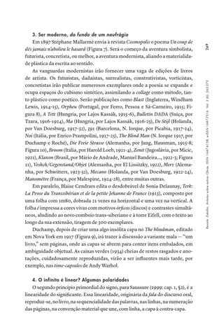 Em 1897 Stéphane Mallarmé envia à revista Cosmopolis o poema Un coup de dés jamais n’abolira le hasard (Figura 7). Será o começo da aventura simbolista, futurista, concretista, ou melhor, a aventura modernista, aliando a materialidade plástica da escrita ao sentido. As vanguardas modernistas irão fornecer uma vaga de edições de livros de artista. Os futuristas, dadaístas, surrealistas, construtivistas, vorticistas, concretistas irão publicar numerosos exemplares onde a poesia se expande e ocupa espaços do cubismo sintético, assimilando a collage como método, tanto plástico como poético. Serão publicações como Blast (Inglaterra, Windham Lewis, 1914-15), Orpheu (Portugal, por Ferro, Pessoa e Sá-Carneiro, 1915; Figura 8), A Tett (Hungria, por Lajos Kassák, 1915-6), Bulletin DADA (Suiça, por Tzara, 1916-1924), Ma (Hungria, por Lajos Kassák, 1916-25), De Stijl (Holanda, por Van Doesburg, 1917-32), 391 (Barcelona, N. Iorque, por Picabia, 1917-24), Noi (Itália, por Enrico Prampolini, 1917-25), The Blind Man (N. Iorque 1917, por Duchamp e Roché), Die Freie Strasse (Alemanha, por Jung, Hausman, 1915-8; Figura 10), Broom (Itália, por Harold Loeb, 1921-4), Zenit (Jugoslávia, por Micic, 1921), Klaxon (Brasil, por Mário de Andrade, Manuel Bandeira…, 1922-3; Figura 11), Veshch/Gegenstand/Objet (Alemanha, por El Lissitzky, 1922), Merz (Alemanha, por Schwitters, 1923-32), Mecano (Holanda, por Van Doesburg, 1922-24), Manomètre (França, por Malespine, 1924-28), entre muitas outras. Em paralelo, Blaise Cendrars edita o desdobrável de Sonia Delaunay, Terk: La Prose du Transsibérian et de la petite Jehanne de France (1913), composto por uma folha com 1m80, dobrada 21 vezes na horizontal e uma vez na vertical. A folha é impressa a cores vivas com motivos órficos (discos) e contrastes simultâneos, aludindo ao novo comboio trans-siberiano e à torre Eifell, com o texto ao longo da sua extensão, tiragem de 300 exemplares. Duchamp, depois de criar uma algo insólita capa no The blindman, editado em Nova York em 1917 (Figura 9), irá trazer à discussão a variante mala — “um livro,” sem páginas, onde as capas se abrem para conter itens embalados, em ambiguidade objetual. As caixas verdes (1934) cheias de restos rasgados e anotações, cuidadosamente reproduzidas, virão a ser influentes mais tarde, por exemplo, nas time-capsules de Andy Warhol.