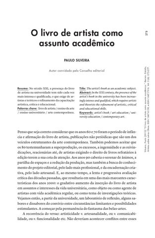 Silveira, Paulo (2012) “O livro de artista como assunto acadêmico.” Revista :Estúdio, Artistas sobre outras Obras. ISSN 1647-6158, e-ISSN 1647-7316. Vol. 3 (6): 273-277.