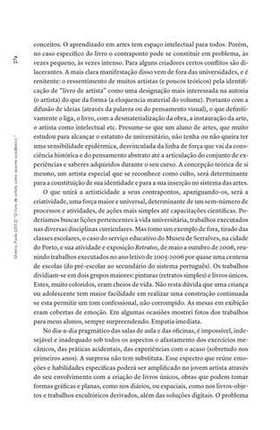 conceitos. O aprendizado em artes tem espaço intelectual para todos. Porém, no caso específico do livro o contraponto pode se constituir em problema, às vezes pequeno, às vezes intenso. Para alguns criadores certos conflitos são dilacerantes. A mais clara manifestação disso vem de fora das universidades, e é renitente: o ressentimento de muitos artistas (e poucos teóricos) pela identificação de “livro de artista” como uma designação mais interessada na autoria (o artista) do que da forma (a eloquencia material do volume). Portanto com a difusão de ideias (através da palavra ou do pensamento visual), o que definitivamente o liga, o livro, com a desmaterialização da obra, a instauração da arte, o artista como intelectual etc. Presume-se que um aluno de artes, que muito estudou para alcançar o estatuto de universitário, não tenha ou não queira ter uma sensibilidade epidérmica, desvinculada da linha de força que vai da consciência histórica e do pensamento abstrato até a articulação do conjunto de experiências e saberes adquiridos durante o seu curso. A concepção teórica de si mesmo, um artista especial que se reconhece como culto, será determinante para a constituição de sua identidade e para a sua inserção no sistema das artes. O que unirá a artisticidade a seus contrapontos, apaziguando-os, será a criatividade, uma força maior e universal, determinante de um sem-número de processos e atividades, de ações mais simples até capacitações científicas. Poderíamos buscar lições pertencentes à vida universitária, trabalhos executados nas diversas disciplinas curriculares. Mas tomo um exemplo de fora, tirado das classes escolares, o caso do serviço educativo do Museu de Serralves, na cidade do Porto, e sua atividade e exposição Retratos, de maio a outubro de 2006, reunindo trabalhos executados no ano letivo de 2005-2006 por quase uma centena de escolas (do pré-escolar ao secundário do sistema português). Os trabalhos dividiam-se em dois grupos maiores: pinturas (retratos simples) e livros únicos. Estes, muito coloridos, eram cheios de vida. Não resta dúvida que uma criança ou adolescente tem maior facilidade em realizar uma construção continuada se esta permitir um tom confessional, não corrompido. As mesas em exibição eram cobertas de emoção. Em algumas ocasiões mostrei fotos dos trabalhos para meus alunos, sempre surpreendendo. Empatia imediata. No dia-a-dia pragmático das salas de aula e das oficinas, é impossível, indesejável e inadequado sob todos os aspectos o afastamento dos exercícios mecânicos, das práticas acidentais, das experiências com o acaso (sobretudo nos primeiros anos). A surpresa não tem substituta. Esse espectro que reúne emoções e habilidades específicas poderá ser amplificado no jovem artista através do seu envolvimento com a criação de livros únicos, obras que podem tomar formas gráficas e planas, como nos diários, ou espaciais, como nos livros-objetos e trabalhos escultóricos derivados, além das soluções digitais. O problema