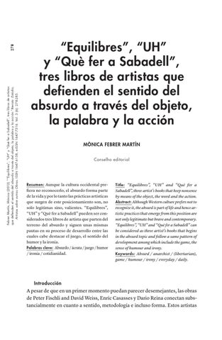 Sabadell”, three artist’s books that keep nonsense by means of the object, the word and the action. Abstract: Although Western culture prefers not to recognize it, the absurd is part of life and hence artistic practices that emerge from this position are not only legitimate but brave and contemporary. “Equilibres”, “UH” and “Què fer a Sabadell” can be considered as three artist’s books that begins in the absurd topic and follow a same pattern of development among which include the game, the sense of humour and irony. Keywords: Absurd / anarchist / (libertarian), game / humour / irony / everyday / daily.