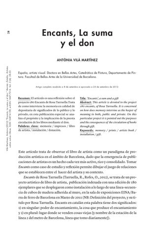 Vilà Martínez, Antònia (2012) “Encants, La suma y el don.” Revista :Estúdio, Artistas sobre outras Obras. ISSN 1647-6158, e-ISSN 1647-7316. Vol. 3 (6): 28-33.