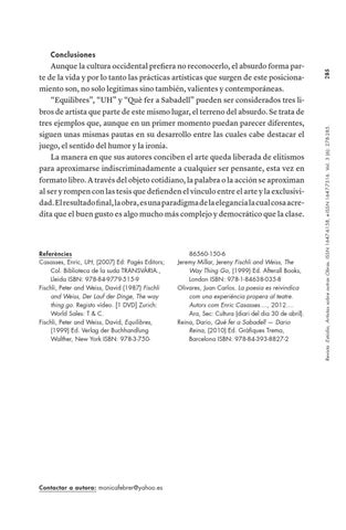 Aunque la cultura occidental prefiera no reconocerlo, el absurdo forma parte de la vida y por lo tanto las prácticas artísticas que surgen de este posicionamiento son, no solo legitimas sino también, valientes y contemporáneas. “Equilibres”, “UH” y “Què fer a Sabadell” pueden ser considerados tres libros de artista que parte de este mismo lugar, el terreno del absurdo. Se trata de tres ejemplos que, aunque en un primer momento puedan parecer diferentes, siguen unas mismas pautas en su desarrollo entre las cuales cabe destacar el juego, el sentido del humor y la ironía. La manera en que sus autores conciben el arte queda liberada de elitismos para aproximarse indiscriminadamente a cualquier ser pensante, esta vez en formato libro. A través del objeto cotidiano, la palabra o la acción se aproximan al ser y rompen con las tesis que defienden el vinculo entre el arte y la exclusividad. El resultado final, la obra, es una paradigma de la elegancia la cual cosa acredita que el buen gusto es algo mucho más complejo y democrático que la clase.