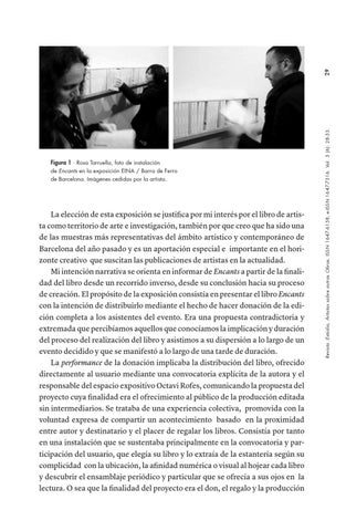 La elección de esta exposición se justifica por mi interés por el libro de artista como territorio de arte e investigación, también por que creo que ha sido una de las muestras más representativas del ámbito artístico y contemporáneo de Barcelona del año pasado y es un aportación especial e importante en el horizonte creativo que suscitan las publicaciones de artistas en la actualidad. Mi intención narrativa se orienta en informar de Encants a partir de la finalidad del libro desde un recorrido inverso, desde su conclusión hacia su proceso de creación. El propósito de la exposición consistía en presentar el libro Encants con la intención de distribuirlo mediante el hecho de hacer donación de la edición completa a los asistentes del evento. Era una propuesta contradictoria y extremada que percibíamos aquellos que conocíamos la implicación y duración del proceso del realización del libro y asistimos a su dispersión a lo largo de un evento decidido y que se manifestó a lo largo de una tarde de duración. La performance de la donación implicaba la distribución del libro, ofrecido directamente al usuario mediante una convocatoria explícita de la autora y el responsable del espacio expositivo Octavi Rofes, comunicando la propuesta del proyecto cuya finalidad era el ofrecimiento al público de la producción editada sin intermediarios. Se trataba de una experiencia colectiva, promovida con la voluntad expresa de compartir un acontecimiento basado en la proximidad entre autor y destinatario y el placer de regalar los libros. Consistía por tanto en una instalación que se sustentaba principalmente en la convocatoria y participación del usuario, que elegía su libro y lo extraía de la estantería según su complicidad con la ubicación, la afinidad numérica o visual al hojear cada libro y descubrir el ensamblaje periódico y particular que se ofrecía a sus ojos en la lectura. O sea que la finalidad del proyecto era el don, el regalo y la producción