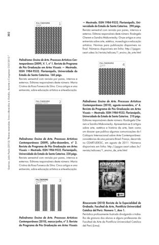 — Mestrado. ISSN 1984-9532. Florianópolis, Universidade do Estado de Santa Catarina. 290 págs. Revista semestral com revisão por pares, internos e externos. Editores responsáveis deste número: Rosângela Cherem e Sandra Makowiecky. Onze artigos e uma entrevista sobre arte, estética, museologia e educação artística. Normas para publicação disponíveis no final. Números disponíveis em linha: http://ppgav. ceart.udesc.br/revista/edicoes/1_ensino_de_arte.html Palíndromo: Ensino de Arte. Processos Artísticos Contemporâneos (2009), V. 1, nº 1. Revista do Programa de Pós Graduação em Artes Visuais — Mestrado. ISSN 1984-9532. Florianópolis, Universidade do Estado de Santa Catarina. 160 págs. Revista semestral com revisão por pares, internos e externos. Editores responsáveis deste número: Maria Cristina da Rosa Fonseca da Silva. Cinco artigos e uma entrevista, sobre educação artística e arte-educação.