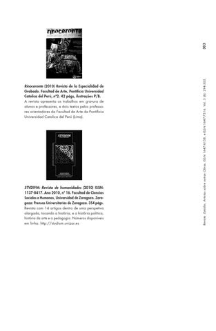 Rinoceronte (2010) Revista de la Especialidad de Grabado. Facultad de Arte, Pontificia Universidad Catolica del Perú, nº2. 42 págs, ilustrações P/B. A revista apresenta os trabalhos em gravura de alunos e professores, e dois textos pelos professores orientadores da Facultad de Arte da Pontificia Universidad Catolica del Perú (Lima).