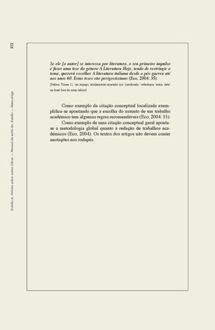 Como exemplo da citação conceptual localizada exemplifica-se apontando que a escolha do assunto de um trabalho académico tem algumas regras recomendáveis (Eco, 2004: 33). Como exemplo de uma citação conceptual geral apontase a metodologia global quanto à redação de trabalhos académicos (Eco, 2004). Os textos dos artigos não devem conter anotações nos rodapés.