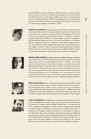 NEIDE MARCONDES (Brasil), Universidade Estadual Paulista (UNESP). Artista visual e professora titular. Doutora em Artes, Universidade de São Paulo (USP). Publicações especializadas, resenhas, artigos, anais de congressos, livros. Membro da Associação Nacional de Pesquisa em Artes Plásticas — ANPAP, Associação Brasileira de Críticos de Arte-ABCA, Associação Internacional de Críticos de Arte-AICA, Conselho Museu da Emigração e das Comunidades, Fafe, Portugal.