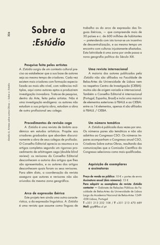 Aquisição de exemplares e assinaturas Preço de venda ao público: 10 € + portes de envio Assinatura anual (dois números): 15 € Para adquirir os exemplares da revista :Estúdio contactar — Gabinete de Relações Públicas da Faculdade de Belas-Artes da Universidade de Lisboa Largo da Academia Nacional de Belas-Artes 1249-058 Lisboa, Portugal T +351 213 252 108 / F +351 213 470 689 Mail: grp@fba.ul.pt