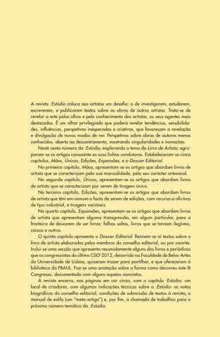 A revista :Estúdio coloca aos artistas um desafio: o de investigarem, estudarem, escreverem, e publicarem textos sobre as obras de outros artistas. Trata-se de revelar a arte pelos olhos e pelo conhecimento dos artistas, os seus agentes mais destacados. É um olhar privilegiado que poderá revelar tendências, sensibilidades, influências, perspetivas inesperadas e criativas, que favoreçam a revelação e divulgação de novos modos de ver. Perspetivas sobre obras de autores menos conhecidos, aberta ao descentramento, mostrando singularidades e inovações. Neste sexto número da :Estúdio, explorando o tema do Livro de Artista, agruparam-se os artigos consoante as suas linhas condutoras. Estabeleceram-se cinco capítulos, Mãos, Únicos, Edições, Expansões, e o Dossier Editorial. No primeiro capítulo, Mãos, apresentam-se os artigos que abordam livros de artista que se caracterizam pela sua manualidade, pelo seu carácter artesanal. No segundo capítulo, Únicos, apresentam-se os artigos que abordam livros de artista que se caracterizam por serem de tiragem única. No terceiro capítulo, Edições, apresentam-se os artigos que abordam livros de artista que têm em comum o facto de serem de edições, com recurso a oficinas de tipo industrial, e tiragens variáveis. No quarto capítulo, Expansões, apresentam-se os artigos que abordam livros de artista que apresentam alguma transgressão, em algum particular, para a fronteira de deixarem de ser livros: folhas soltas, livros que se tornam ilegíveis, caixas e outros. O quinto capítulo apresenta o Dossier Editorial. Reúnem-se aí textos sobre o livro de artista elaborados pelos membros do conselho editorial, ou por convite. Inclui-se uma secção que apresenta resumidamente alguns dos livros e periódicos que os congressistas do último CSO’2012, decorrido na Faculdade de Belas-Artes da Universidade de Lisboa, quiseram trazer para partilhar, e que ofereceram à biblioteca da FBAUL. Faz-se uma anotação sobre a forma como decorreu este III Congresso, documentada com alguns aspetos concretos. A revista encerra, nas páginas em cor cinza, com o capítulo :Estúdio: um local de criadores, com algumas indicações técnicas sobre a :Estúdio: as notas biográficas do conselho editorial, condições de submissão de textos à revista, o manual de estilo (um “meta-artigo”) e, por fim, a chamada de trabalhos para o próximo número temático da :Estúdio.
