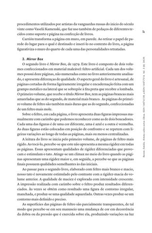 O segundo livro é Mirror Box, de 1979. Este livro é composto de dois volumes confeccionados em material maleável: feltro artificial. Cada um dos volumes possui doze páginas, não numeradas como no livro anteriormente analisado, e apresenta diferenças de qualidade. O aspecto geral do livro é artesanal, de páginas cortadas de forma ligeiramente irregular e encadernação feita com um grampo metálico na lateral que se sobrepõe à fita preta que recobre a lombada. O primeiro volume, que recebe o título Mirror Box, tem as páginas brancas mais amareladas que as do segundo, de material mais branco. As páginas do primeiro volume de feltro são também mais duras que as do segundo, confeccionadas de um feltro mais mole. Sobre o feltro, em cada página, o livro apresenta duas figuras impressas manualmente com carimbo que podemos reconhecer como as de dois boxeadores. Cada uma das figuras é de uma cor diferente, uma é azul e a outra é vermelha. As duas figuras estão colocadas em posição de confronto e se repetem com ligeiras variações ao longo de todas as páginas, mais ou menos centralizadas. A leitura do livro se inicia pelo primeiro volume, de páginas de feltro mais rígido. Ao tocá-lo, percebe-se que este não apresenta a mesma rigidez em todas as páginas. Essas apresentam qualidades de rigidez diferenciadas que provocam e estimulam o tato. Atinge-se um clímax no meio do livro quando as páginas apresentam uma rigidez maior e, em seguida, a percebe-se que as páginas finais possuem qualidades semelhantes às das iniciais. Ao passar para o segundo livro, elaborado com feltro mais branco e macio, nosso tato é novamente estimulado pelo contraste com a rigidez-macia do volume anterior. A qualidade de maciez é explorada com intensidade crescente. A impressão realizada com carimbo sobre o feltro produz resultados diferenciados. Às vezes se obtém como resultado uma figura de contorno irregular, manchada, e produz-se uma qualidade aquarelada. Outras vezes produz-se um contorno mais definido e preciso. As superfícies das páginas de feltro são parcialmente transparentes, de tal modo que percebe-se em seu manuseio uma mudança de cor em decorrência da dobra ou da pressão que é exercida sobre ela, produzindo variações na luz