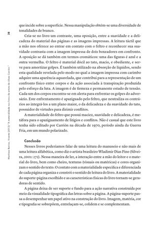 que incide sobre a superfície. Nessa manipulação obtém-se uma diversidade de tonalidades de branco. Cria-se no livro um contraste, uma oposição, entre a suavidade e a delicadeza do material das páginas e as imagens impressas. A leitura táctil que a mão nos oferece ao entrar em contato com o feltro e reconhecer sua suavidade contrasta com a imagem impressa de dois boxeadores em confronto. A oposição se dá também em termos cromáticos: uma das figuras é azul e a outra vermelha. O feltro é material dócil ao tato, macio, e obediente, e serve para amortizar golpes. É também utilizado na absorção de líquidos, sendo esta qualidade revelada pelo modo no qual a imagem impressa com carimbo adquire uma aparência aquarelada, que contribui para a representação de um confronto físico entre corpos e da ação associada à transpiração produzida pelo esforço da luta. A imagem é de firmeza e permanente estado de tensão. Cada um dos corpos encontra-se em alerta para enfrentar os golpes do adversário. Este enfrentamento é apaziguado pelo feltro, que neutraliza os contrários ao integrá-los a um plano maior, o da delicadeza e da suavidade do tato, possuidor de virtudes para dirimir conflitos. A materialidade do feltro que possui maciez, suavidade e delicadeza, é metáfora para o apaziguamento de litígios e conflitos. Não é casual que este livro tenha sido editado por Carrión na década de 1970, período ainda da Guerra Fria, em um mundo polarizado. Conclusão
