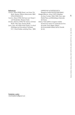 0-89822-041-6/0-87905-207-4 (Peregrine Smith)/0-87905-280-5(pbk.) Moeglin-Delcroix, Anne (1997) Esthetique du livre d’ artiste 1960/1980. Paris: Jean Michel Place and Bibliothéque Nationale de France. Silveira, Paulo (2001) A pagina violada: Da ternura à injúria na construção do livro de artista. Porto Alegre: Editora da Universidade Federal de Rio Grande do Sul.