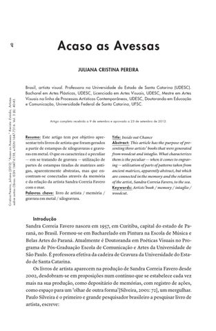 senting three artists’ books that were generated from woodcut and intaglio. What characterizes them is the peculiar — when it comes to engraving — utilization of parts of patterns taken from ancient matrices, apparently abstract, but which are connected in the memory and the relation of the artist, Sandra Correia Favero, to the sea. Keywords: Artists’book / memory / intaglio / woodcut.