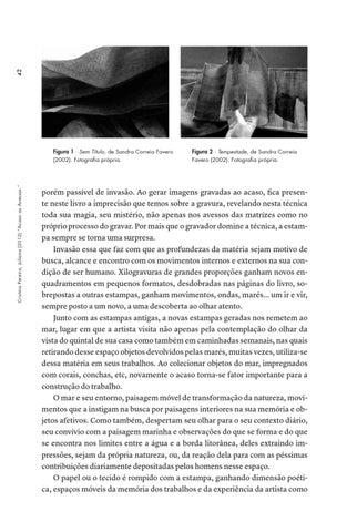 porém passível de invasão. Ao gerar imagens gravadas ao acaso, fica presente neste livro a imprecisão que temos sobre a gravura, revelando nesta técnica toda sua magia, seu mistério, não apenas nos avessos das matrízes como no próprio processo do gravar. Por mais que o gravador domine a técnica, a estampa sempre se torna uma surpresa. Invasão essa que faz com que as profundezas da matéria sejam motivo de busca, alcance e encontro com os movimentos internos e externos na sua condição de ser humano. Xilogravuras de grandes proporções ganham novos enquadramentos em pequenos formatos, desdobradas nas páginas do livro, sobrepostas a outras estampas, ganham movimentos, ondas, marés... um ir e vir, sempre posto a um novo, a uma descoberta ao olhar atento. Junto com as estampas antigas, a novas estampas geradas nos remetem ao mar, lugar em que a artista visita não apenas pela contemplação do olhar da vista do quintal de sua casa como também em caminhadas semanais, nas quais retirando desse espaço objetos devolvidos pelas marés, muitas vezes, utiliza-se dessa matéria em seus trabalhos. Ao colecionar objetos do mar, impregnados com corais, conchas, etc, novamente o acaso torna-se fator importante para a construção do trabalho. O mar e seu entorno, paisagem móvel de transformação da natureza, movimentos que a instigam na busca por paisagens interiores na sua memória e objetos afetivos. Como também, despertam seu olhar para o seu contexto diário, seu convívio com a paisagem marinha e observações do que se forma e do que se encontra nos limites entre a água e a borda litorânea, deles extraindo impressões, sejam da própria natureza, ou, da reação dela para com as péssimas contribuições diariamente depositadas pelos homens nesse espaço. O papel ou o tecido é rompido com a estampa, ganhando dimensão poética, espaços móveis da memória dos trabalhos e da experiência da artista como