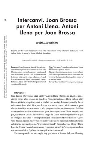 Antoni Llena by Joan Brossa. Abstract: Joan Brossa and Antoni Llena exchange their artistic personalities on the artist book ‘intercanvi’. It draws upon language that is shaped as a visual poem. Keywords: artist’s book / visual poem / language.