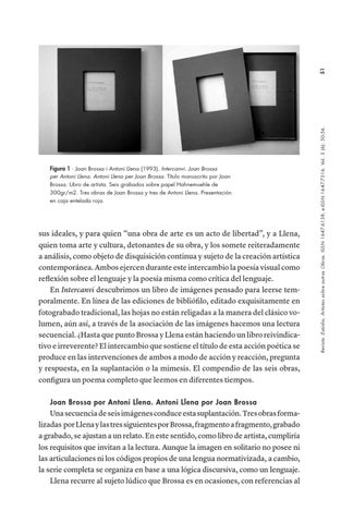 sus ideales, y para quien “una obra de arte es un acto de libertad”, y a Llena, quien toma arte y cultura, detonantes de su obra, y los somete reiteradamente a análisis, como objeto de disquisición continua y sujeto de la creación artística contemporánea. Ambos ejercen durante este intercambio la poesía visual como reflexión sobre el lenguaje y la poesía misma como crítica del lenguaje. En Intercanvi descubrimos un libro de imágenes pensado para leerse temporalmente. En línea de las ediciones de bibliófilo, editado exquisitamente en fotograbado tradicional, las hojas no están religadas a la manera del clásico volumen, aún así, a través de la asociación de las imágenes hacemos una lectura secuencial. ¿Hasta que punto Brossa y Llena están haciendo un libro reivindicativo e irreverente? El intercambio que sostiene el título de esta acción poética se produce en las intervenciones de ambos a modo de acción y reacción, pregunta y respuesta, en la suplantación o la mimesis. El compendio de las seis obras, configura un poema completo que leemos en diferentes tiempos. Joan Brossa por Antoni Llena. Antoni Llena por Joan Brossa