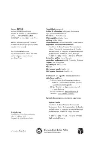 Revista :Estúdio Faculdade de Belas-Artes da Universidade de Lisboa / Centro de Investigação e de Estudos em Belas-Artes — Largo da Academia Nacional de Belas-Artes, 1249-058 Lisboa, Portugal T +351 213 252 108 / F +351 213 470 689 Mail: estudio@fba.ul.pt