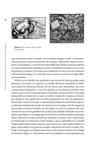 una información sobre el mundo. En sus diarios imagen y texto se entremezclan para perfeccionar la transmisión de mensajes. Apenas hay espacios sin rellenar en las páginas, y en los bocetos más elaborados integra notas descriptivas con letras mayúsculas rodeando la escena. Es habitual encontrar en sus series de grabados y pinturas este mismo procedimiento de intervenciones textuales enmarcando la imagen, las cuales derivan en no pocas ocasiones de algún dibujo de sus diarios. Bellver es un creador muy productivo que precisa de ideas genuinas para plasmar en sus obras. De regreso a su estudio del barrio madrileño de Malasaña utiliza con frecuencia bocetos de los diarios para materializar una serie o gestar piezas definitivas. A veces ha partido con un proyecto artístico en la cabeza y pese a las vivencias del viaje no ha podido sustraerse de él. Un ejemplo inmejorable es el diario de su viaje en 2008 a la ciudad de Granada, en Nicaragua (Figura 1). En aquella época estaba preparando una serie de aguafuertes iluminados a mano en los que se autorretrataba bailando con distintas mujeres en diversas ciudades del mundo. Se puede ver en el cuaderno de Nicaragua un boceto que lo muestra bailando con una mujer con pelo de serpiente que concuerda con uno de los grabados de la citada serie titulado Bailando con la soledad (2009) (Figura 2). La imagen proviene de una anécdota referida en el propio diario: Mientras el artista paseaba por una playa encontró a una viejecita que le vaticinó que no viviría por mucho tiempo, y que le aguardaba en su ciudad Chiguacoatl, la diosa mujer serpiente, que todo lo da y todo lo quita. Bellver no pudo evitar reflejar esta poderosa imagen. Alrededor del boceto escribió ‘Bailando el merengue con Chiguacoatl en una noche del mes de junio en la ciudad de Granada’ (Figura 1). Este mismo icono lo ha utilizado en otros grabados, por