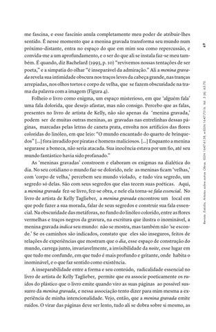 me fascina, e esse fascínio anula completamente meu poder de atribuir-lhes sentido. É nesse momento que a menina gravada transforma seu mundo num próximo-distante, entra no espaço do que em mim soa como repercussão, e convida-me a um aprofundamento, e o ser do que ali se instala faz-se meu também. É quando, diz Bachelard (1993, p. 10) “revivemos nossas tentações de ser poeta,” e a simpatia do olhar “é inseparável da admiração.” Ali a menina gravada revela sua intimidade obscura nos traços leves da cabeça grande, nas tranças arrepiadas, nos olhos tortos e corpo de velha, que se fazem obscuridade na trama da palavra com a imagem (Figura 4). Folheio o livro como enigma, um espaço misterioso, em que ‘alguém fala’ uma fala dolorida, que desejo afastar, mas não consigo. Percebo que as falas, presentes no livro de artista de Kelly, não são apenas da ‘menina gravada,’ podem ser de muitas outras meninas, as gravadas nas entrelinhas dessas páginas, marcadas pelas letras de caneta prata, envolta nos artifícios das flores coloridas do linóleo, em que leio: “O mundo encantado do quarto de brinquedos” [...] fora invadido por piratas e homens maliciosos. [...] Enquanto a menina segurasse a boneca, não seria atacada. Sua inocência estava por um fio, até seu mundo fantástico havia sido profanado.” As ‘meninas gravadas’ constroem e elaboram os enigmas na dialética do dia. No seu cotidiano o mundo faz-se dolorido, nele as meninas ficam ‘velhas,’ com ‘corpo de velha,’ percebem seu mundo violado, e tudo vira segredo, um segredo só delas. São com seus segredos que elas tecem suas poéticas. Aqui, a menina gravada fez-se livro, fez-se obra, e nele ela torna-se fala essencial. No livro de artista de Kelly Taglieber, a menina gravada encontrou um local em que pode fazer a sua morada, falar de seus segredos e construir sua fala essencial. Na obscuridade das metáforas, no fundo do linóleo colorido, entre as flores vermelhas e traços negros da gravura, na escritura que ilustra o inominável, a menina gravada indica seu mundo: não se mostra, mas também não ‘se esconde.’ Se os caminhos são indicados, constato que eles são inseguros, feitos de relações de experiências que mostram que o dia, esse espaço de construção do mundo, carrega junto, invariavelmente, a invisibilidade da noite, esse lugar em que tudo me confunde, em que tudo é mais profundo e gritante, onde habita o inominável, e o que faz sentido como existência. A inseparabilidade entre a forma e seu conteúdo, radicalidade essencial no livro de artista de Kelly Taglieber, permite que eu associe poeticamente os ruídos do plástico que o livro emite quando viro as suas páginas ao possível sussurro da menina gravada, e nessa associação tento dizer para mim mesma a experiência de minha intencionalidade. Vejo, então, que a menina gravada emite ruídos. O virar das páginas deve ser lento, tudo ali se dobra sobre si mesmo, as