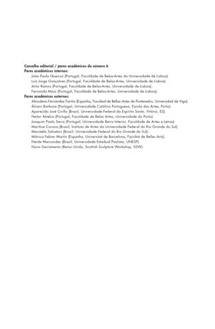 Conselho editorial / pares académicos do número 6 Pares académicos internos: João Paulo Queiroz (Portugal, Faculdade de Belas-Artes da Universidade de Lisboa). Luís Jorge Gonçalves (Portugal, Faculdade de Belas-Artes, Universidade de Lisboa). Artur Ramos (Portugal, Faculdade de Belas-Artes, Universidade de Lisboa). Fernanda Maio (Portugal, Faculdade de Belas-Artes, Universidade de Lisboa). Pares académicos externos: Almudena Fernández Fariña (Espanha, Facultad de Bellas Artes de Pontevedra, Universidad de Vigo). Álvaro Barbosa (Portugal, Universidade Católica Portuguesa, Escola das Artes, Porto). Aparecido José Cirillo (Brasil, Universidade Federal do Espírito Santo, Vitória, ES). Heitor Alvelos (Portugal, Faculdade de Belas Artes, Universidade do Porto). Joaquim Paulo Serra (Portugal, Universidade Beira Interior, Faculdade de Artes e Letras). Marilice Corona (Brasil, Instituto de Artes da Universidade Federal do Rio Grande do Sul). Maristela Salvatori (Brasil, Universidade Federal do Rio Grande do Sul). Mònica Febrer Martín (Espanha, Universitat de Barcelona, Facultat de Belles Arts). Neide Marcondes (Brasil, Universidade Estadual Paulista, UNESP). Nuno Sacramento (Reino Unido, Scottish Sculpture Workshop, SSW).