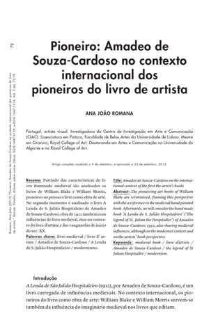 tional context of the first the artist’s books Abstract: The pioneering art books of William Blake are scrutinized, framing this perspective with the a reference to the medieval hand painted book. Afterwards, we will consider the hand made book ‘A Lenda de S. Julião Hospitaleiro’ (‘The legend of St. Julian the Hospitaller’) of Amadeo de Souza-Cardoso, 1912, also sharing medieval influences, although on the modernist context and on the artists’ book perspective. Keywords: medieval book / livre d’artiste / Amadeo de Souza-Cardoso / the legend of St Julian Hospitaller / modernism.