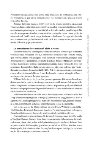 Interessa-nos nesta abordagem ao livro medieval os aspectos que os artistas vão mais tarde recuperar. Isto é, o manuscrito iluminado em formato codex, que combina texto com imagem, letra capitular ornamentada, margens com decoração floral e geométrica abstracta. É no final da Idade Média que a ilustração nas margens dos livros de iluminuras conhece a maior variedade, estes são os espaços de maior liberdade para os autores, e são estes os livros que vão influenciar os artistas do séculos XVIII, XIX e XX. Os livros medievais continham essencialmente temas bíblicos. O uso do dourado era uma adoração a Deus e servia para literalmente iluminar a página. William Blake (1757-1827) escritor, pintor e gravador. Foi auto-editor de todos os seus livros, onde texto e imagem estavam contidos numa única matriz de cobre, a impressão resulta densamente colorida. O processo gráfico de Blake foi batizado pelo próprio como Impressão Iluminada, é uma referência aos manuscritos iluminados medievais. Publicou vários livros em vida, mas o de maior sucesso resulta da união das Songs of Innocence (1789) com as Songs of Experience em 1794, impressas a cor e aguareladas. As imagens gravadas por Blake emanam energia, embora de escala reduzida (c.13x8cm), as figuras aparentam uma escala monumental. Um século depois de Blake publicar os seus livros, William Morris (18341896) funda a Kelmscott Press, em Londres. Foi escritor, político e designer. Desenhou têxteis, papel de parede, azulejos, vitral, mobiliário e livros. Embora Morris tenha publicado 66 livros referimos apenas o livro The works of Geoffrey Chaucer. Chaucer é um livro extremamente elaborado que foi realizado entre 1891 e 1896, sobre influência do imaginário medieval. Edward Burne-Jones realiza 87 ilustrações gravadas em madeira e William Morris é autor da tipografia, iniciais decoradas, decorações de margens e design da encadernação. Morris recupera um fazer artesanal.
