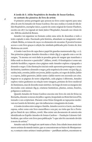 O primeiro artista português que pensou no livro como suporte para uma obra de arte foi Amadeo de Souza-Cardoso. Em 1912 realiza A Lenda de São Julião Hospitaleiro, exemplar único, a partir do conto original de Gustav Flaubert, escrito em 1877 La Légende de Saint Julien l’Hospitalier, baseado nos vitrais do séc. XIII da catedral de Rouen. Amadeo vai organizar no formato codex uma série de desenhos e todo o texto copiado à mão. Fascinado pela história, abundante no imaginário sobre a Idade Média, os temas de caça e os elementos de encantar. É possível termos acesso a este livro graças à edição fac-similada publicada pelo Centro de Arte Moderna em 2006. A Lenda é um livro de capa dura e papel de guardas marmoreado (fig. 1 e 2). Nas primeiras páginas Amadeo desenha o título (fig.3) a aguada com a cor de sangue, “A mesma cor será dada às pesadas gotas de sangue que mancham a folha onde se descreve o parricídio”. (Alfaro, 2006). O frontispício é como um símbolo heráldico, seguem cinco páginas onde Amadeo explora a tipografia a dourado e negro. E dez ilustrações iniciais onde apresenta personagens e cenas da história, também a dourado e negro, pela sequência do conto: rei/pai (fig.4), rainha/mãe, eremita, Julião em jovem, Julião caçador, rei sogro de Julião, Julião e a esposa, Julião guerreiro, Julião santo e Julião morto em ascensão aos céus. Seguem-se as páginas do texto caligrafado, cada página é diferente, Amadeo explora vários grafismos na relação texto-imagem, próximo do livro medieval de iluminuras, mas de desenho mais sintético. Ao longo do texto as margens são decoradas com animais (fig.5), criaturas fantásticas, plantas, armas, brasões, polígonos e arabescos. Quando Amadeo de Souza-Cardoso executa este livro ele está de férias na Bretanha, durante os meses de julho e agosto, hospedado no Hotel du Lion d’Or, tornado o seu scriptorium. Durante estas férias fotografa as tapeçarias medievais no Castelo de Kériolet, que vão influenciar o imaginário da Lenda. A Lenda circulou entre amigos e família. Amadeo escreve a Lucie, sua futura esposa, sobre como este livro maravilhou o seu pai, na visita que fez a Portugal no Natal de 1912 (Alfaro, 2006). Mas existe um documento de autoria não identificada no Espólio Amadeo de Souza-Cardoso — Fundação Calouste Gulbenkian, que refere este livro para publicação “o que não foi executado devido à morte do artista.” Amadeo saiu de Portugal em 1906 rumo a Paris. Esta cidade íman atraia inúmeros artistas do mundo inteiro, que se concentravam no bairro de Montparnasse, o contacto entre artistas é muito próximo — partilham ateliers, encontram-se