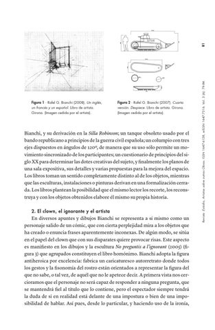 Bianchi, y su derivación en la Silla Robinson; un tanque obsoleto usado por el bando republicano a principios de la guerra civil española; un columpio con tres ejes dispuestos en ángulos de 120º, de manera que su uso sólo permite un movimiento sincronizado de los participantes; un cuestionario de principios del siglo XX para determinar las dotes creativas del sujeto, y finalmente los planos de una sala expositiva, sus detalles y varias propuestas para la mejora del espacio. Los libros toman un sentido completamente distinto al de los objetos, mientras que las esculturas, instalaciones o pinturas derivan en una formalización cerrada. Los libros plantean la posibilidad que el mismo lector los recorte, los reconstruya y con los objetos obtenidos elabore él mismo su propia historia. 2. El clown, el ignorante y el artista
