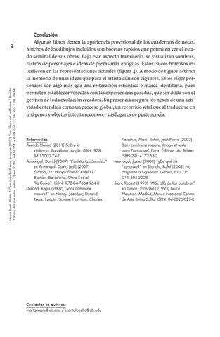 Algunos libros tienen la apariencia provisional de los cuadernos de notas. Muchos de los dibujos incluidos son bocetos rápidos que permiten ver el estado seminal de sus obras. Bajo este aspecto transitorio, se visualizan sombras, rastros de personajes e ideas de piezas más antiguas. Estos calcos borrosos interfieren en las representaciones actuales (figura 4). A modo de signos activan la memoria de unas ideas que para el artista aún son vigentes. Estos viejos personajes son algo más que una reiteración estilística o marca identitaria, pues permiten establecer vínculos con las experiencias pasadas, que sin duda son el germen de toda evolución creadora. Su presencia asegura los nexos de una actividad entendida como un proceso global, un recorrido vital que al traducirse en imágenes y objetos intenta reconocer sus lugares de pertenencia.
