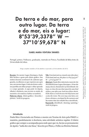 85 Maria Ventura Tavares, Isabel (2012) “Da terra e do mar, para outro lugar. Da terra e do mar, eis o lugar: 8º53’39,3378’’ W — 37º10’59,678’’ N.” Revista :Estúdio, Artistas sobre outras Obras. ISSN 1647-6158, e-ISSN 1647-7316. Vol. 3 (6): 85-91.