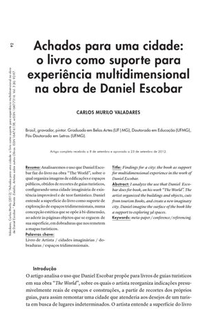 92 Valadares, Carlos Murilo (2012) “Achados para uma cidade: o livro como suporte para experiência multidimensional na obra de Daniel Escobar.” Revista :Estúdio, Artistas sobre outras Obras. ISSN 1647-6158, e-ISSN 1647-7316. Vol. 3 (6): 92-97.