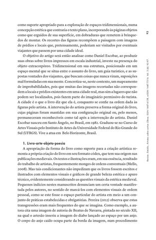como suporte apropriado para a exploração de espaços tridimensionais, numa concepção estética que contraria o texto plano, incorporando às páginas objetos como que erguidos de sua superfície, em dobraduras que remetem à brinquedos de montar. Os recortes das figuras recompõem a paisagem com imagens de prédios e locais que, pretensamente, poderiam ser visitados por eventuais viajantes que passem por uma cidade ideal. O objetivo do artigo será então analisar como Daniel Escobar, ao produzir suas obras sobre livros impressos em escala industrial, investe na presença do objeto extracorpóreo. Tridimensional em sua estrutura, posicionado em um espaço mental que se situa entre o assunto do livro, um guia turístico, e as supostas vontades dos viajantes, que buscam coisas que nunca viram, suposições mal formuladas em sua mente. Concretiza-se, neste contexto, um mapeamento de improbabilidades, pois que muitas das imagens recortadas não correspondem a locais e prédios existentes em uma cidade real, mas sim a lugares que não podem ser localizados, pois fazem parte do imaginário permissivo do turista. A cidade é o que o livro diz que ela é, conquanto se confie na ordem dada às figuras pelo artista. A intervenção do artista preserva a forma original do livro, cujas páginas foram mantidas em sua configuração original ou, pelo menos, permaneceram reconhecíveis como tal após a intervenção do artista. Daniel Escobar nasceu em Santo Ângelo, no Brasil, em 1982. Graduou-se no Curso de Artes Visuais pelo Instituto de Artes da Universidade Federal do Rio Grande do Sul (UFRGS). Vive a atua em Belo Horizonte, Brasil.