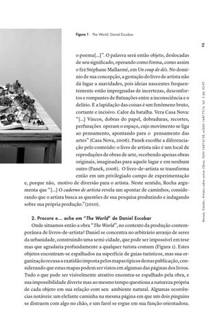 o poema[...]”. O palavra será então objeto, deslocadas de seu significado, operando como forma, como assim o fez Stéphane Mallarmé, em Un coup de dés. No domínio de sua concepção, a gestação do livro de artista não dá lugar a suavidades, pois ideias nascentes frequentemente estão impregnadas de incertezas, desconfortos e rompantes de flutuações entre a inconsciência e o delírio. E a lapidação das coisas é um fenômeno bruto, cortante e incisivo. Calor da batalha. Vera Casa Nova: “[...] Vincos, dobras do papel, dobraduras, recortes, perfurações operam o espaço, cujo movimento se liga ao pensamento, apontando para o pensamento das artes” (Casa Nova, 2006). Panek escolhe a diferenciação pelo conteúdo: o livro de artista não é um local de reproduções de obras de arte, recebendo apenas obras originais, imaginadas para aquele lugar e em nenhum outro (Panek, 2006). O livro-de-artista se transforma então em um privilegiado campo de experimentação e, porque não, motivo de diversão para o artista. Neste sentido, Rocha argumenta que “[...] O caderno de artista revela um apontar de caminhos, considerando que o artista busca as questões de sua pesquisa produzindo e indagando sobre sua própria produção.”(2010). 2. Procure e... ache em “The World” de Daniel Escobar