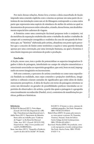 Referências 8a Bienal do Mercosul (2011). Porto Alegre. [Consult. 2013-03-30]. Disponível em <URL: http://bienalmercosul.siteprofissional.com/>. Atelier Romo (2011). Depoimento de Sebastián Romo sobre seu trabalho para “Cadernos de Viagem” na 8a Bienal do Mercosul. Vídeo. Ano: 2011. [Consult. 2012/01/05]. Disponível em: <http://www.youtube.com/ watch?v=943lBGF834U>. Besse, Jean-Marc (2011). “Geografia e Existência, a partir da obra de Eric Dardel”. IN: Dardel,