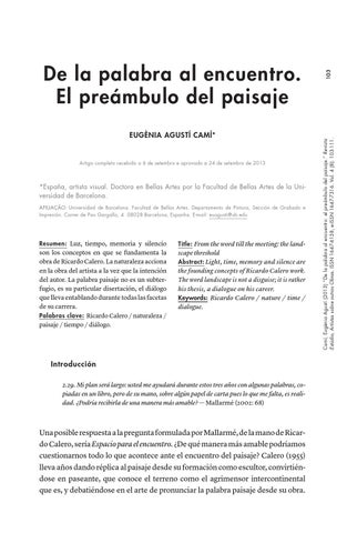 103 Camí, Eugènia Agustí (2013) “De la palabra al encuentro: el preámbulo del paisaje.” Revista :Estúdio, Artistas sobre outras Obras. ISSN 1647-6158, e-ISSN 1647-7316. Vol. 4 (8): 103-111.