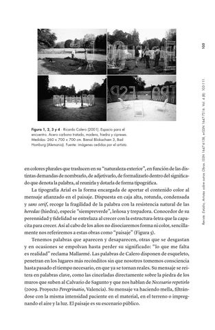 en colores plurales que traslucen en su “naturaleza exterior”, en función de las distintas demandas de nombrarlo, de adjetivarlo, de formalizarlo dentro del significado que denota la palabra, al reunirla y dotarla de forma tipográfica. La tipografía Arial es la forma encargada de aportar el contenido color al mensaje afianzado en el paisaje. Dispuesta en caja alta, rotunda, condensada y sans serif, recoge la fragilidad de la palabra con la resistencia natural de las heredas (hiedra), especie “siempreverde”, leñosa y trepadora. Conocedor de su perennidad y fidelidad se entrelaza al crecer con la estructura-letra que la capacita para crecer. Así al cabo de los años no disociaremos forma ni color, sencillamente nos referiremos a estas obras como “paisaje” (Figura 5). Tenemos palabras que aparecen y desaparecen, otras que se desgastan y en ocasiones se empolvan hasta perder su significado: “lo que me falta es realidad” reclama Mallarmé. Las palabras de Calero disponen de esqueleto, penetran en los lugares más recónditos sin que nosotros tomemos consciencia hasta pasado el tiempo necesario, en que ya se tornan reales. Su mensaje se reitera en palabras clave, como las cinceladas directamente sobre la piedra de los muros que suben al Calvario de Sagunto y que nos hablan de Necesario repetirlo (2009. Proyecto Peregrinatio, Valencia). Su mensaje va haciendo mella, filtrándose con la misma intensidad paciente en el material, en el terreno o impregnando el aire y la luz. El paisaje es su escenario público.