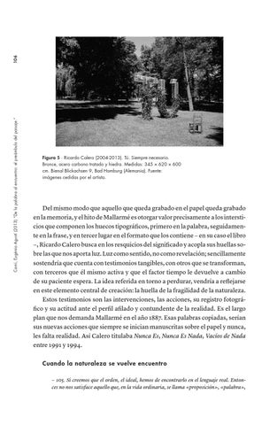 Del mismo modo que aquello que queda grabado en el papel queda grabado en la memoria, y el hito de Mallarmé es otorgar valor precisamente a los intersticios que componen los huecos tipográficos, primero en la palabra, seguidamente en la frase, y en tercer lugar en el formato que los contiene − en su caso el libro −, Ricardo Calero busca en los resquicios del significado y acopla sus huellas sobre las que nos aporta luz. Luz como sentido, no como revelación; sencillamente sostendría que cuenta con testimonios tangibles, con otros que se transforman, con terceros que él mismo activa y que el factor tiempo le devuelve a cambio de su paciente espera. La idea referida en torno a perdurar, vendría a reflejarse en este elemento central de creación: la huella de la fragilidad de la naturaleza. Estos testimonios son las intervenciones, las acciones, su registro fotográfico y su actitud ante el perfil afilado y contundente de la realidad. Es el largo plan que nos demanda Mallarmé en el año 1887. Esas palabras copiadas, serían sus nuevas acciones que siempre se inician manuscritas sobre el papel y nunca, les falta realidad. Así Calero titulaba Nunca Es, Nunca Es Nada, Vacíos de Nada entre 1991 y 1994. Cuando la naturaleza se vuelve encuentro − 105. Si creemos que el orden, el ideal, hemos de encontrarlo en el lenguaje real. Entonces no nos satisface aquello que, en la vida ordinaria, se llama «proposición», «palabra»,